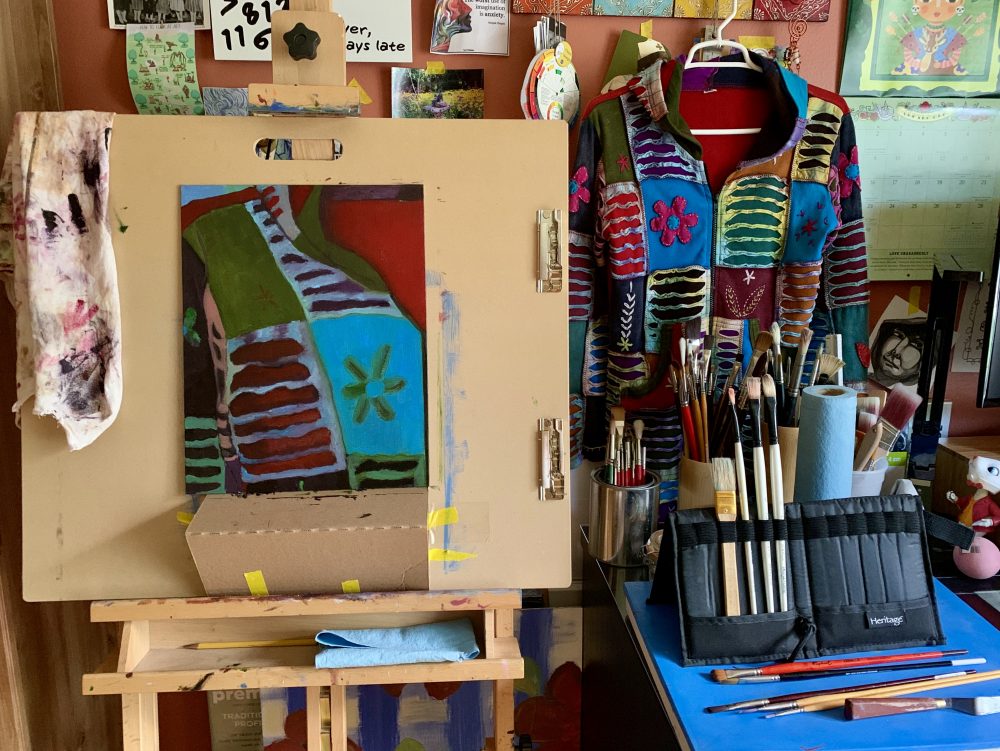 One of our first assignments was to paint some type of material or fabric. My in-class attempt was terrible, so I scrapped it and painted a piece at home. The fabric I chose was a colorful zip-up sweatshirt/ jacket that I bought at an art fair years back. I hung it and using a picture frame mat I visually cropped the subject into an interesting and manageable size.