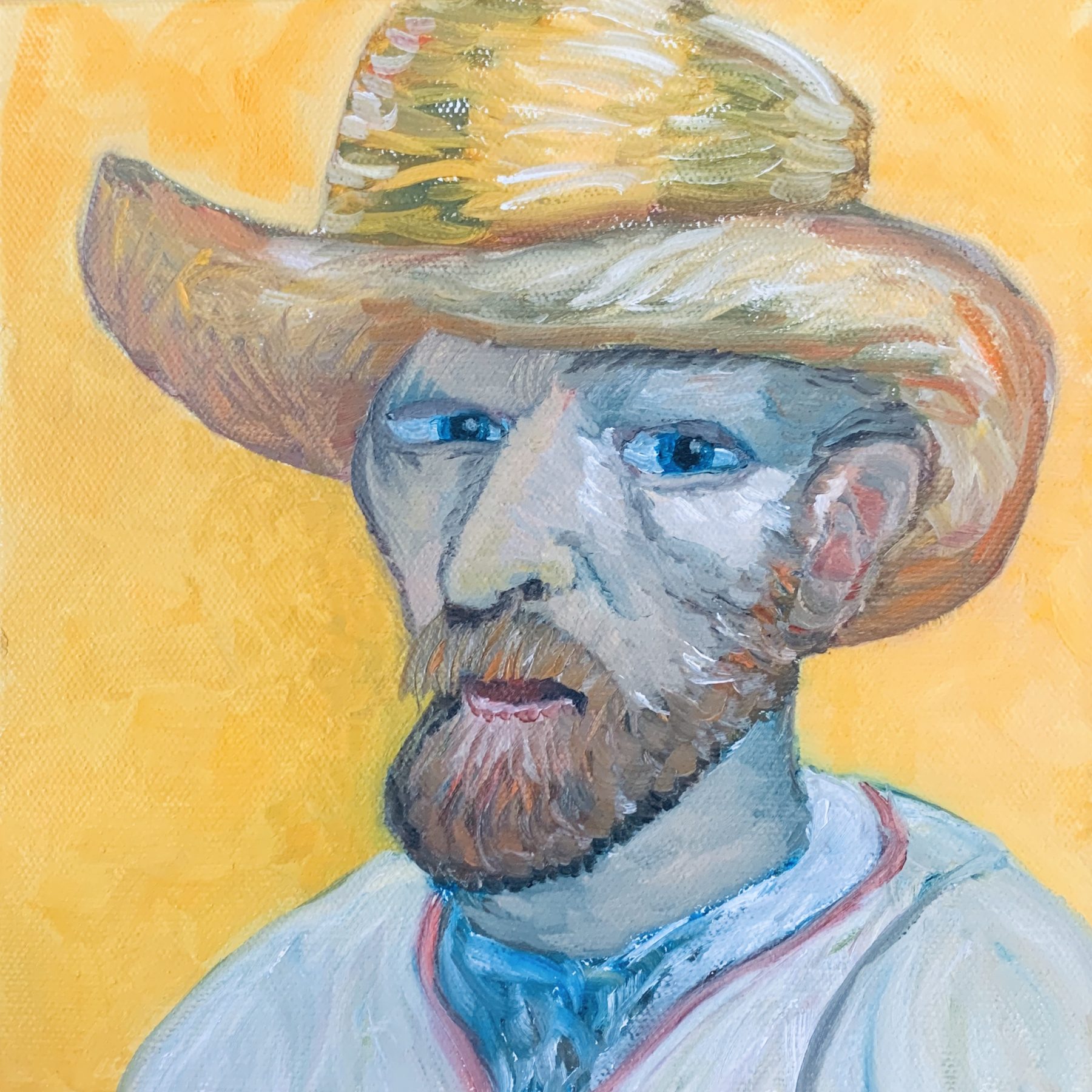 We did class exercises in Fast and Ugly and Pale Tonality using large canvases and brushes in order to get more fearless and “push the paint around more.” One of our home assignments was to make a small copy of a Van Gogh since he was a master ‘paint pusher’. I chose to copy one of his self portraits on a small square canvas. I used quick visible strokes and worked way faster than I usually do. In the end, he looked like a skinny version of himself, but I kind of liked that.