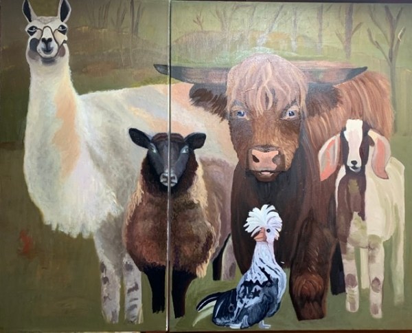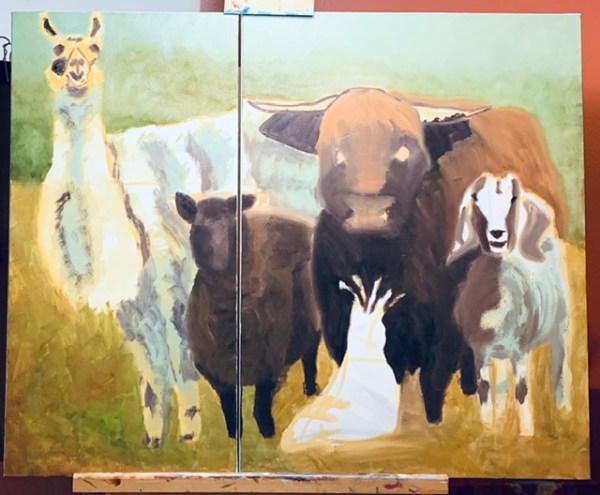 I couldn’t really decide on an idea for the diptych so I went with a picture I’d saved to paint some day. The image is of several farm animals standing together and taken by well-known animal photographer Rob MacInnis.