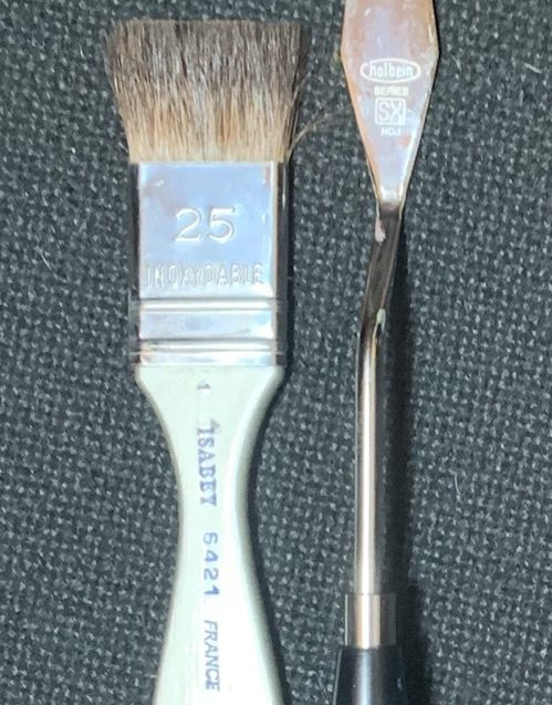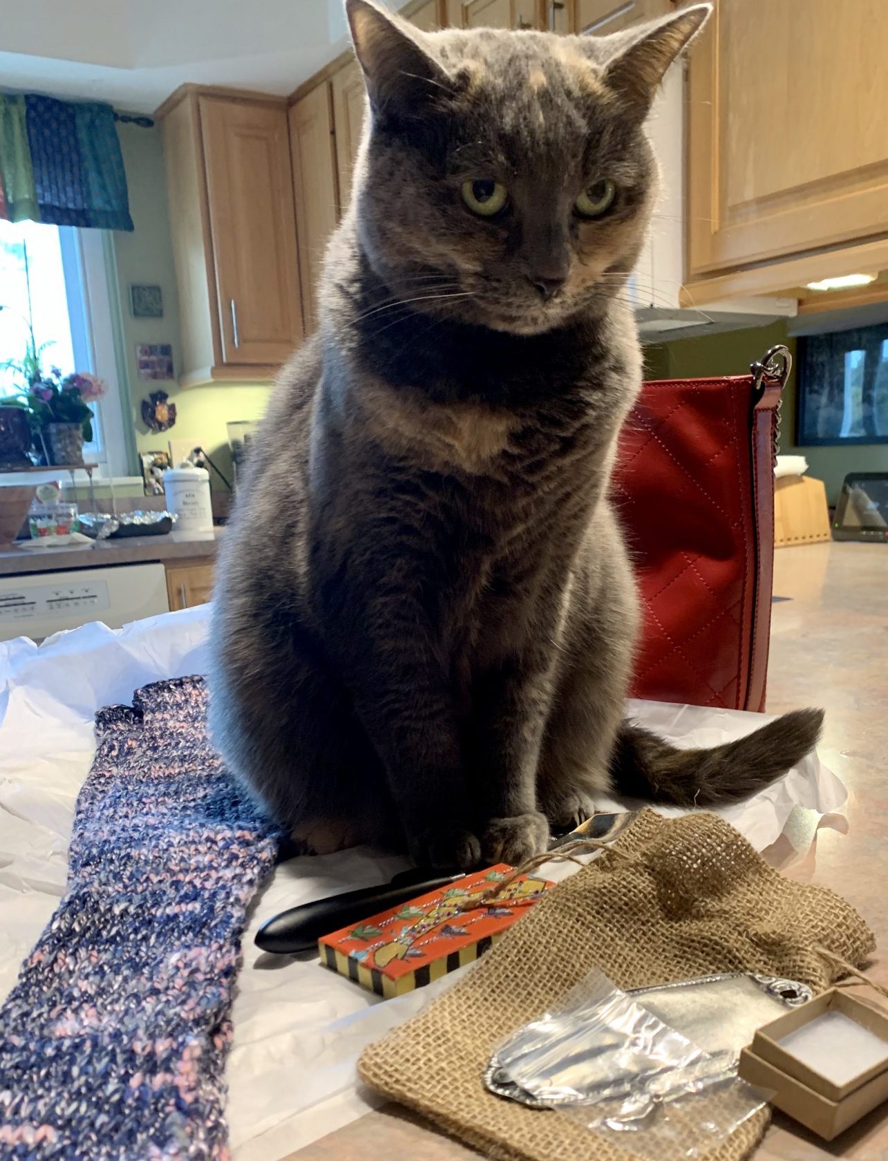 In addition to the Milagros, Nancy gave me an awesome palette knife and a mini Isabey painting brush! One of my favorites!! Laura brought delicious strawberry preserves for everyone, Kristen painted a mini-milagro canvas of an arm, and Cynthia (who is an incredible dressmaker) hand-knitted a pair of arm cozies for me!! You can see all the wonderful gifts in the last picture — Zoe the cat approved! It was such a wonderful afternoon and I truly feel blessed to have these incredible women in my life!