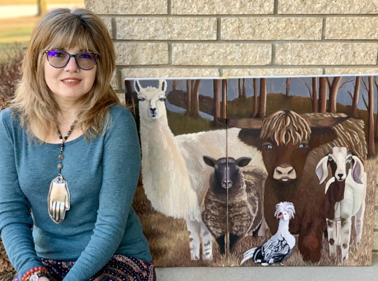After a week or so at home, the surgical pain was gone and I was eager to get back to painting. Although I was still in a cast, my arm was bandaged nearly straight (approx 90° angle) which allowed me to paint– broader, looser strokes anyway. I managed to work on the farm animal diptych begun in November from the Painting With Attitude class with Nancy Mitchnick. A couple weeks later, the stitches were out and I was freed from the cast. I completed the painting, which my older son has endearingly named, “Barnyard Surprise!”