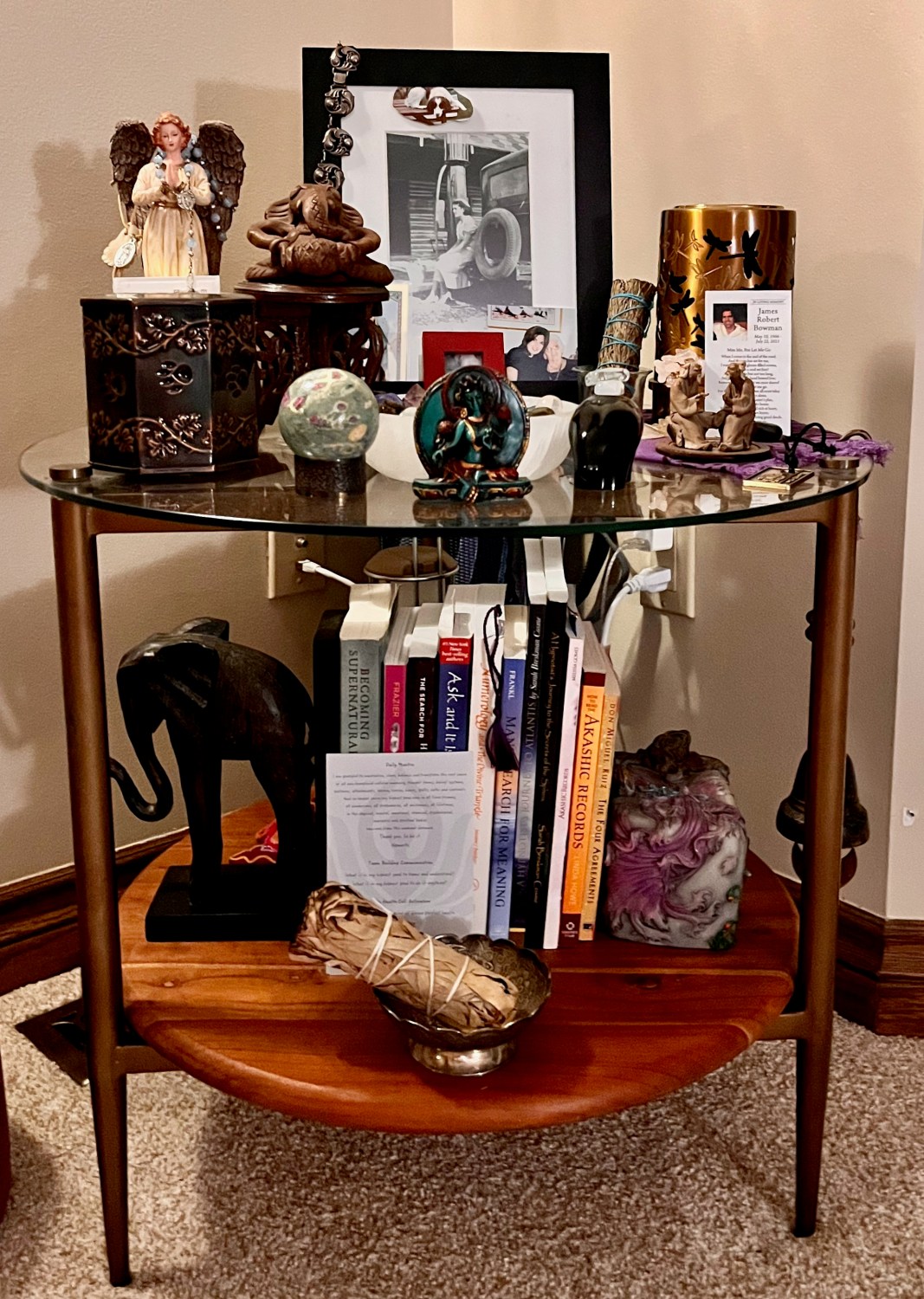 Then I read Shirley MacLaine’s books and Linda Goodman’s Sun Signs and later Star Signs, James Redfield’s The Celestine Prophecy and The Medicine Wheel: Earth Astrology by Sunbear and Wabun Wind. For a gift one year I received a beautiful Onyx black bear with Clear Quartz crystal on his back. I still have him today — he sits on my altar.