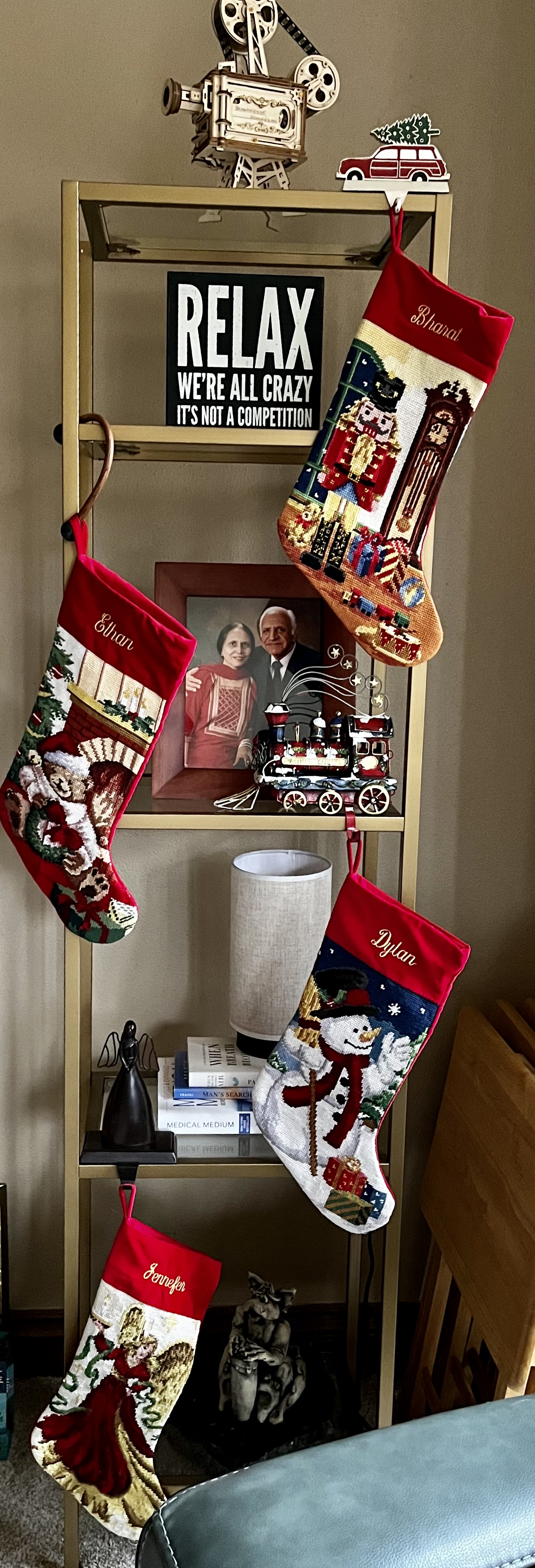 For Christmas I just pulled out a few of the decorations since I was still in recuperation mode from the car accident and couldn’t do a lot of heavy lifting (who am I kidding I can’t do ANY heavy lifting— ever 😂 ). Since our fireplace does not have a mantle, I used our glass bookcase as a makeshift mantle to hang up stockings and put the gifts under the glass table with the angels on top as a makeshift Christmas tree. Not the usual decorations, but it worked, and it was good enough!